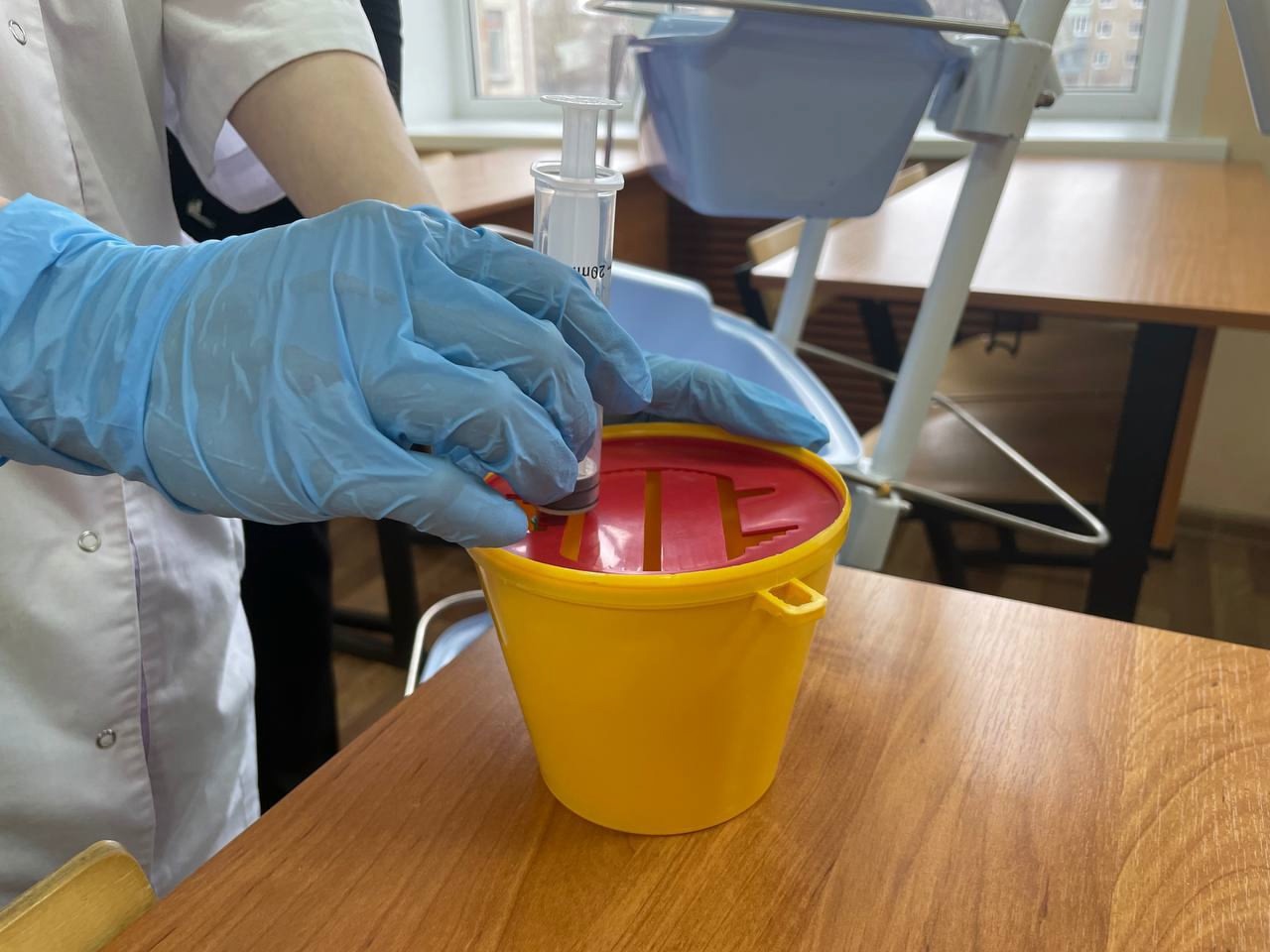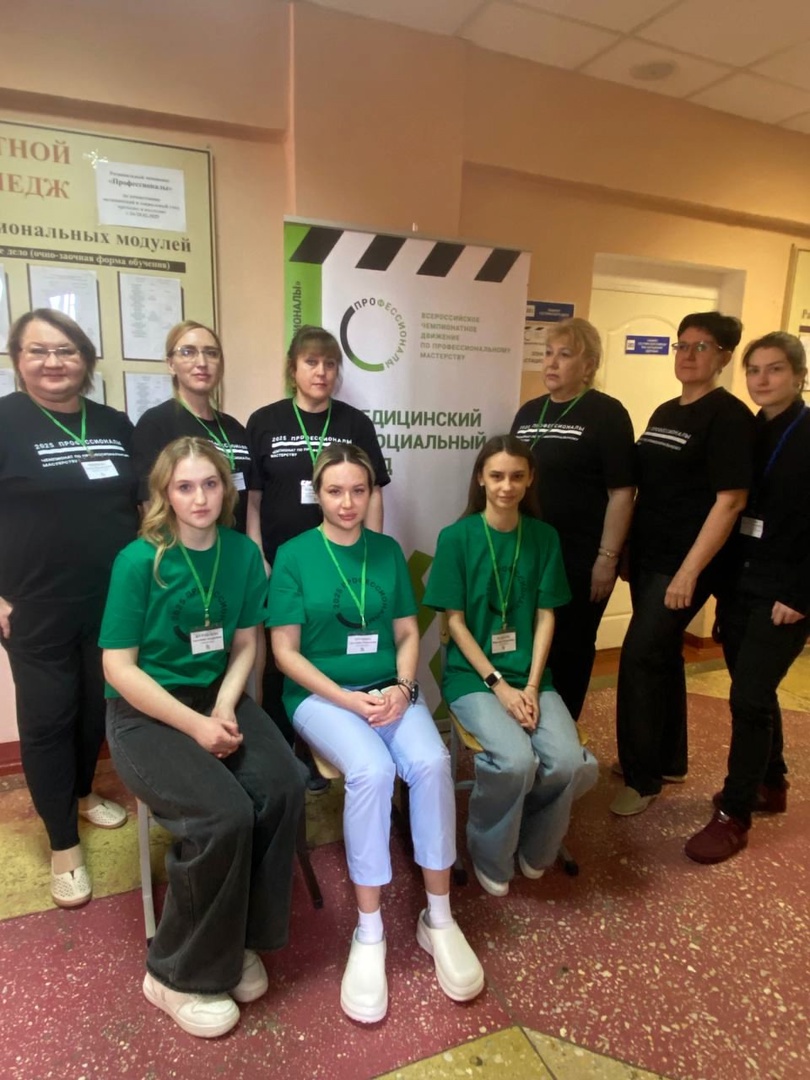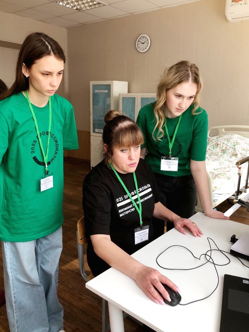Сегодня в работе площадки участвуют волонтеры 13 группы специальности «Сестринское дело». Волонтеры сопровождают участников, меняют расходные материалы, проводят уборку площадок.