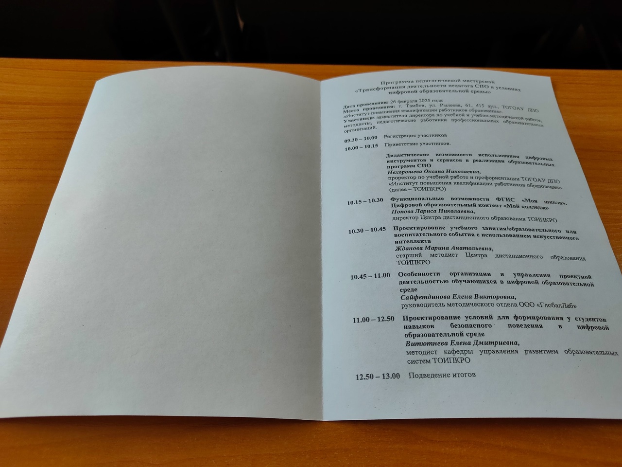Сегодня, 26 февраля 2025, заместитель директора по учебной работе Балабанова А.Н. и методист колледжа Мелихов Ю.Ю. принимают участие в педагогической мастерской «Трансформация деятельности педагога СПО в условиях цифровой образовательной среды». Мероприятие проходит в рамках проведения деловой программы регионального чемпионата по профессиональному мастерству «Профессионалы».