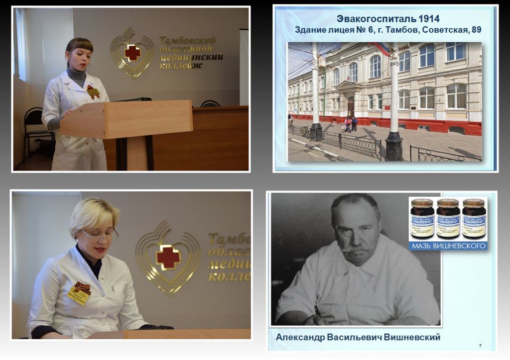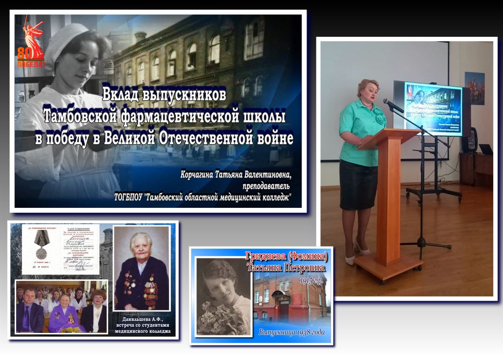 В работе секции «Тамбовская область в годы Великой Отечественной войны» преподаватель ТОГБПОУ «Тамбовский областной медицинский колледж» Корчагина Татьяна Валентиновна представила вниманию участников конференции доклад «Аптека, госпиталь, война», посвященный выпускникам Тамбовской фармацевтической школы — участникам Великой Отечественной войны. Тамбовская фармацевтическая школа за годы войны подготовила свыше 800 специалистов для аптек прифронтовых и тыловых госпиталей. Именно руками фармацевтов готовились тонны стерильных растворов и кровезамещающих жидкостей, чтобы работа госпиталей не останавливалась ни на минуту. Вместе с врачами они оказывали первую медицинскую помощь гражданам, пострадавшим от обстрелов, бомбежек, солдатам, раненным в рамках исполнения боевых задач.