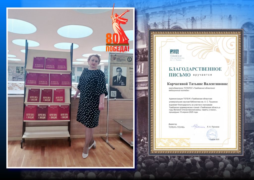За активное участие в программе Тамбовских краеведческих чтений «Тамбовская область в годы Великой Отечественной войны: память и поиск» Корчагина Татьяна Валентиновна отмечена Благодарственным письмом Администрации ТОГБУК «Тамбовская областная универсальная научная библиотека им. А.С. Пушкина»