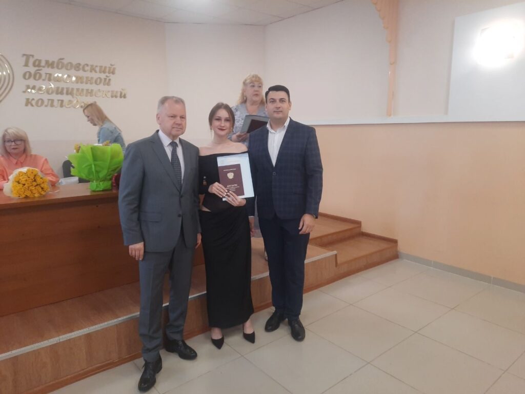 В Тамбовском областном медицинском колледже продолжается церемония вручения дипломов. Дипломы о среднем профессиональном образовании получили выпускники специальностей «Сестринское дело», «Лабораторная диагностика» и «Лечебное дело». От работодателей сегодня присутствовали Вдовиченко Михаил Сергеевич – главный врач городской поликлиники №5 города Тамбова, Дудырева Ирина Владимировна – заведующий клинико-диагностической лабораторией Тамбовской областной детской клинической больницы.