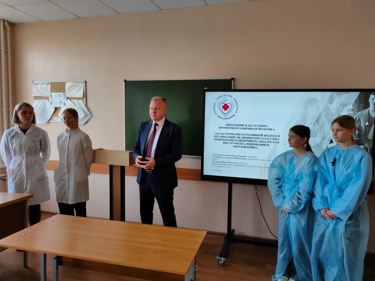 Заместитель директора по УР, заслуженный учитель РФ Балабанова А.Н. продемонстрировала школьникам реализуемый проект «Школьник как студент», который вошел в число образцов лучших практик деятельности медицинских и фармацевтических организаций России по итогам Конкурса лучших практик образовательных организаций, осуществляющих подготовку медицинских и фармацевтических кадров среднего звена на базе ВУНМЦ Минздрава России (сентябрь 2025). Наибольший интерес посетителей вызвал раздел данного проекта по созданию и использованию цифровых аватаров.